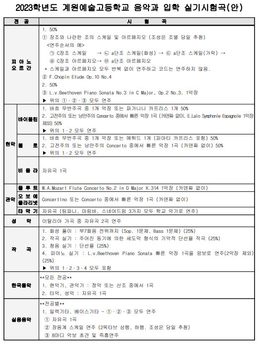 2023학년도 계원예술고등학교 음악과 입학 실기시험곡 안내 본문