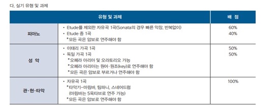 피아노 1명 성악 1명 현악 1명 관.타악 1명