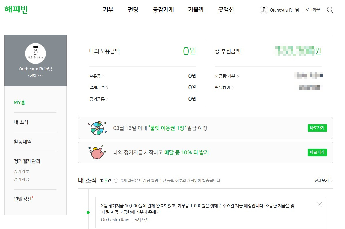 2021년부터는 아주 작은 금액이지만 소액으로 기부적금을 하여 2023년 2월까지 총 25회를 정기기부를 하였습니다.