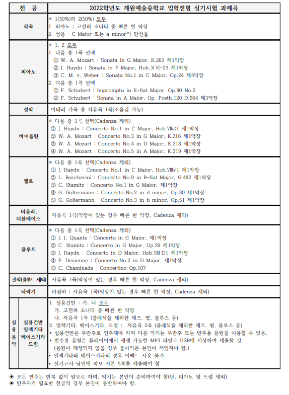 2022학년도 계원예술중학교 입학전형 실기시험 곡목안내입니다.