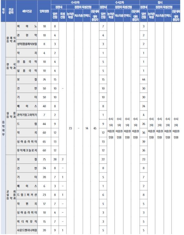 세부적으로 음악의 장르(양악,국악), 파트(피아노,성악,현악,관악, 타악 등) 에 따라 세부전공이 나뉘어지게 됩니다.