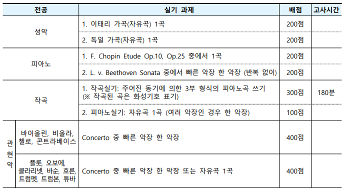 세부적으로 음악의 장르(양악,국악), 파트(피아노,성악,현악,관악, 타악 등) 에 따라 세부전공이 나뉘어지게 됩니다.