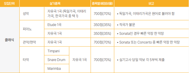 세부적으로 음악의 장르(양악,국악), 파트(피아노,성악,현악,관악, 타악 등) 에 따라 세부전공이 나뉘어지게 됩니다.