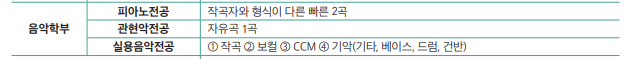 세부적으로 음악의 장르(양악,국악), 파트(피아노,성악,현악,관악, 타악 등) 에 따라 세부전공이 나뉘어지게 됩니다.