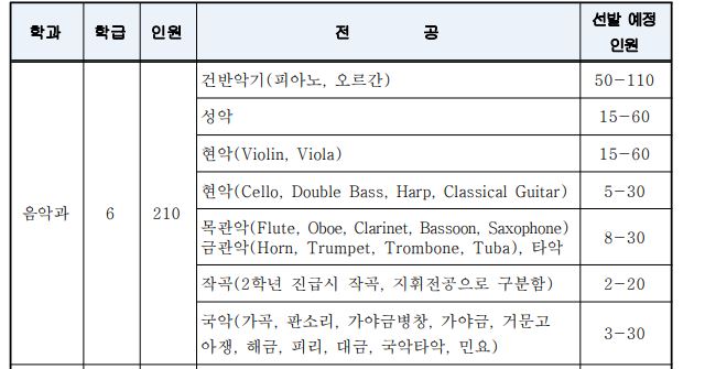세부적으로 음악의 장르(양악,국악), 파트(피아노,성악,현악,관악, 타악 등) 에 따라 세부전공이 나뉘어지게 됩니다.