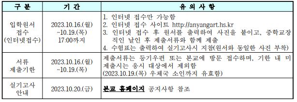 * 위에 관한 자세한 사항은 안양예고 입학 홈페이지 참조