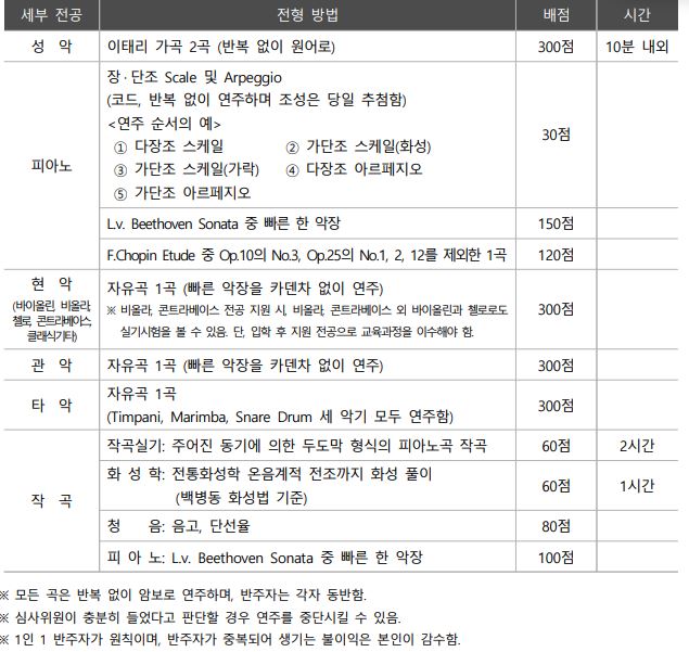 세부적으로 음악의 장르(양악,국악), 파트(피아노,성악,현악,관악, 타악 등) 에 따라 세부전공이 나뉘어지게 됩니다.