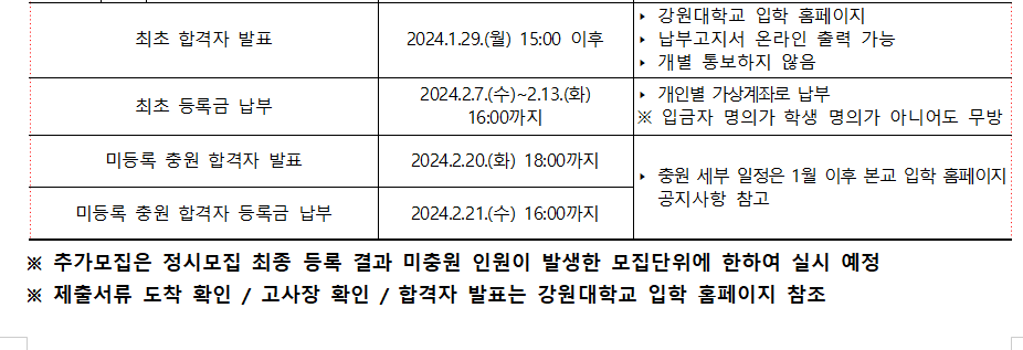 ㄱ) 합격자발표 : 2024년 01월 29일(월) 15시 이후 / 강원대 입학 홈페이지