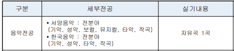 세부적으로 음악의 장르(양악,국악), 파트(피아노,성악,현악,관악, 타악 등) 에 따라 세부전공이 나뉘어지게 됩니다.